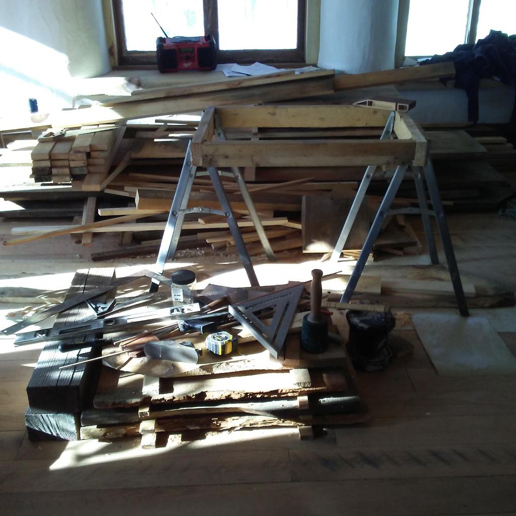 J. started with the cabinet for our beautiful kitchen sink, which we had found at a garage sale. The great thing about off-grid kitchen building is that it’s all carpentry, no plumbing or electrical. Any of those fancy bells and whistles we’ll retrofit later. For now, we’re keeping our old friend the bucket beneath the drain and a pitcher for water.