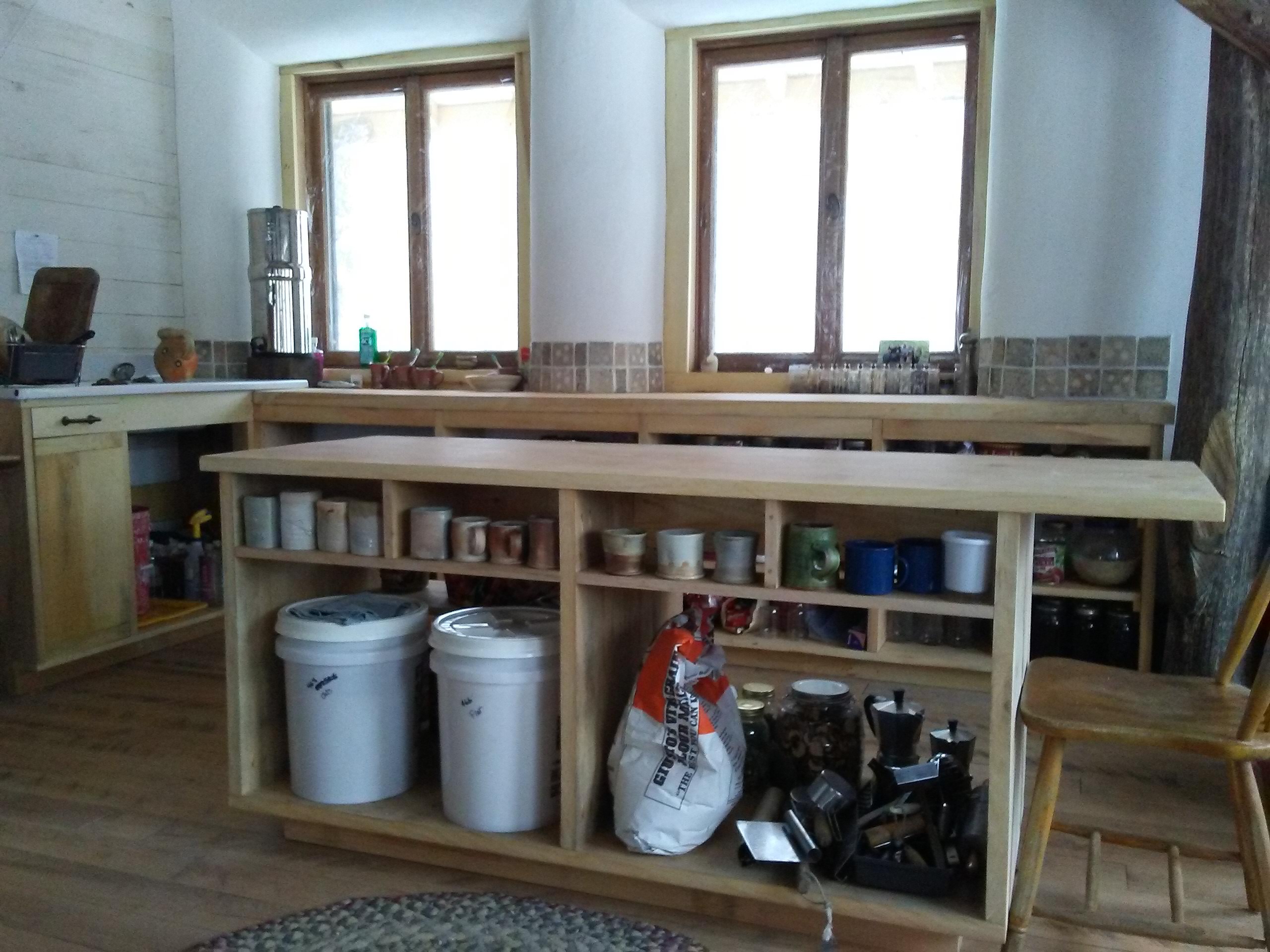 Next J. set to work on the counter along the windowed wall, with its cabinets beneath. I wanted to be able to use the deep window wells above the straw bale walls to extend my counter space. This way we could have an expanse of counter space (so vast I could almost weep), while the shelves below are pretty shallow—a limitation I see as a positive, since I’m prone to losing things in the back tiers of cabinets. We designed the shelves in the cabinets to be the height of quart canning jars, three jars deep, so we can get a lot of those suckers in there.