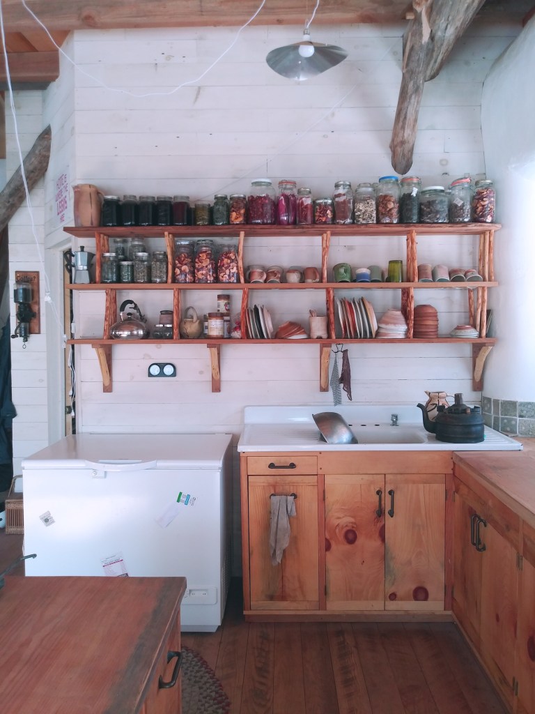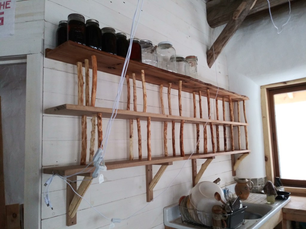Finally, on the newly created bathroom wall we had room for shelves or cabinets. We opted for open shelves because I’m a potter and all our dishes are pretty; plus I love looking at stuff in jars. J. created drainage slots in the oak shelves so we could drip dry our dishes over the sink, and I peeled twigs from our black cherry coppice to serve as the upright supports. The diagonals brackets below are from a disturbingly large trunk of buckthorn.