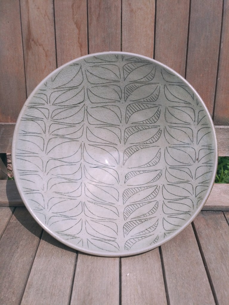 7″ wide, 2.5″ tall. Glossy grey-green celadon glaze over a delicately hand-drawn pattern. Dark clay on the underside. Great size bowl for soup, or berries on the tabletop.