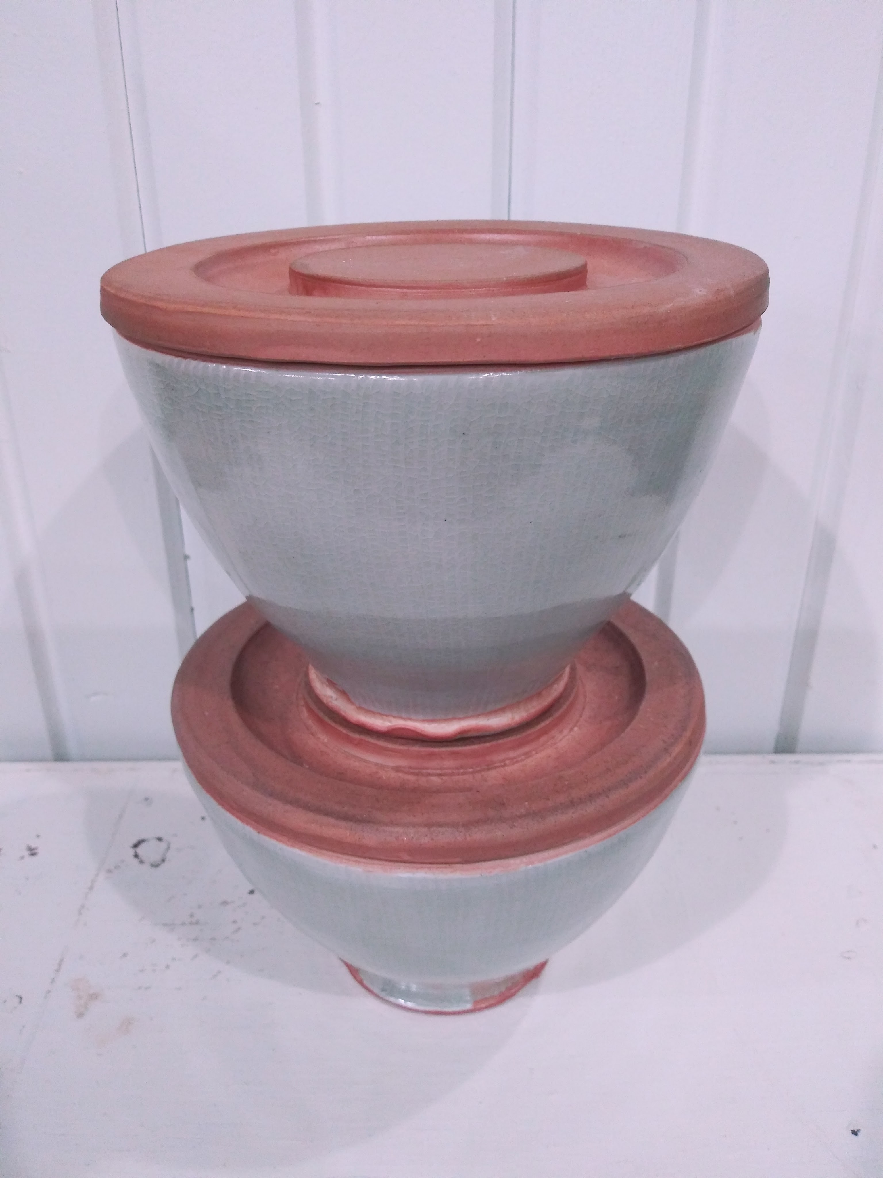 Just the bowl to reach for when you have something to stash in the fridge. Goes from the fridge to the microwave to the table elegantly. Easy clean celadon glaze with rustic slipped lid. Exterior combed with a subtle striped design. 6″ wide, 4″ high. 2 available.