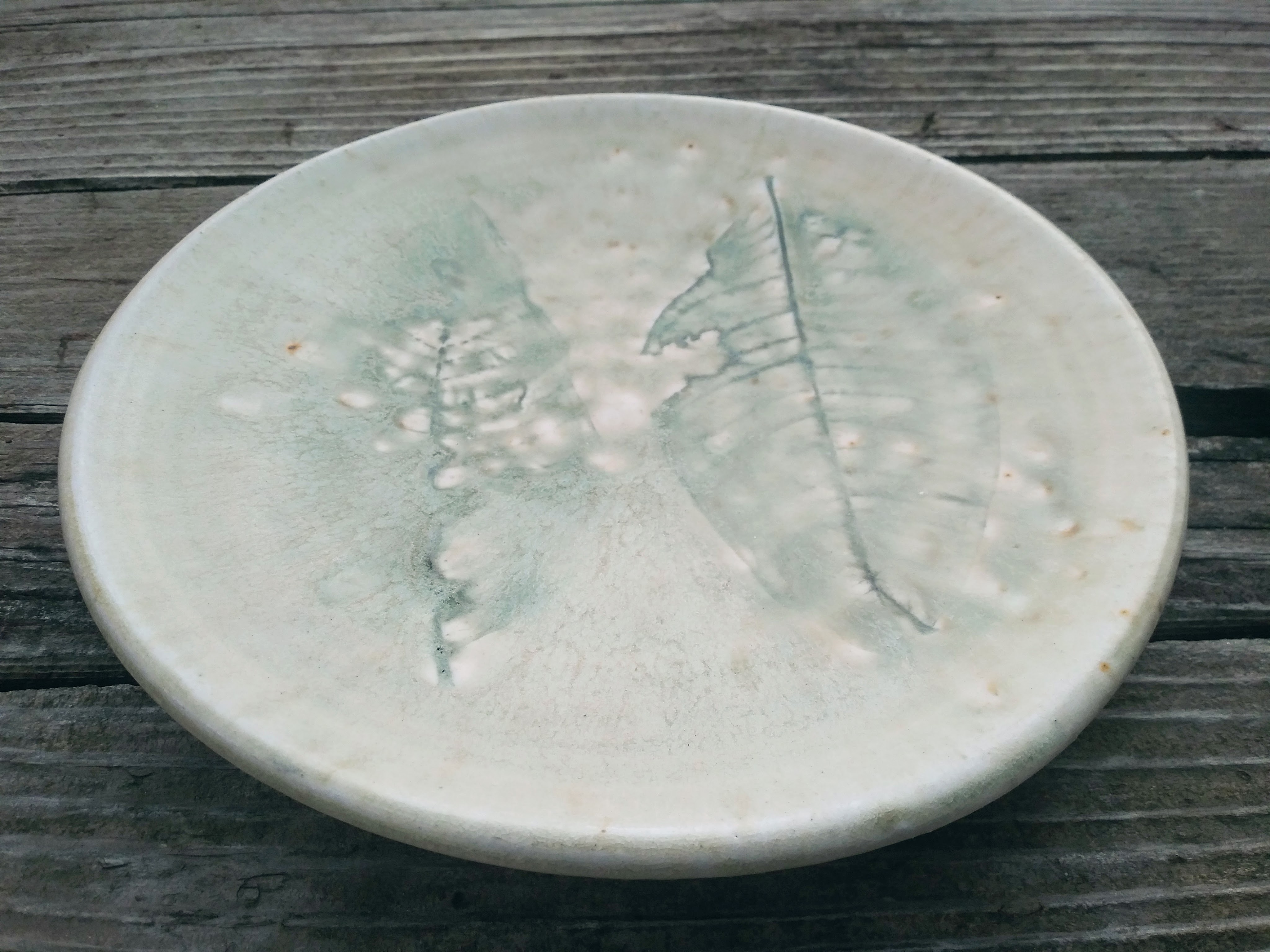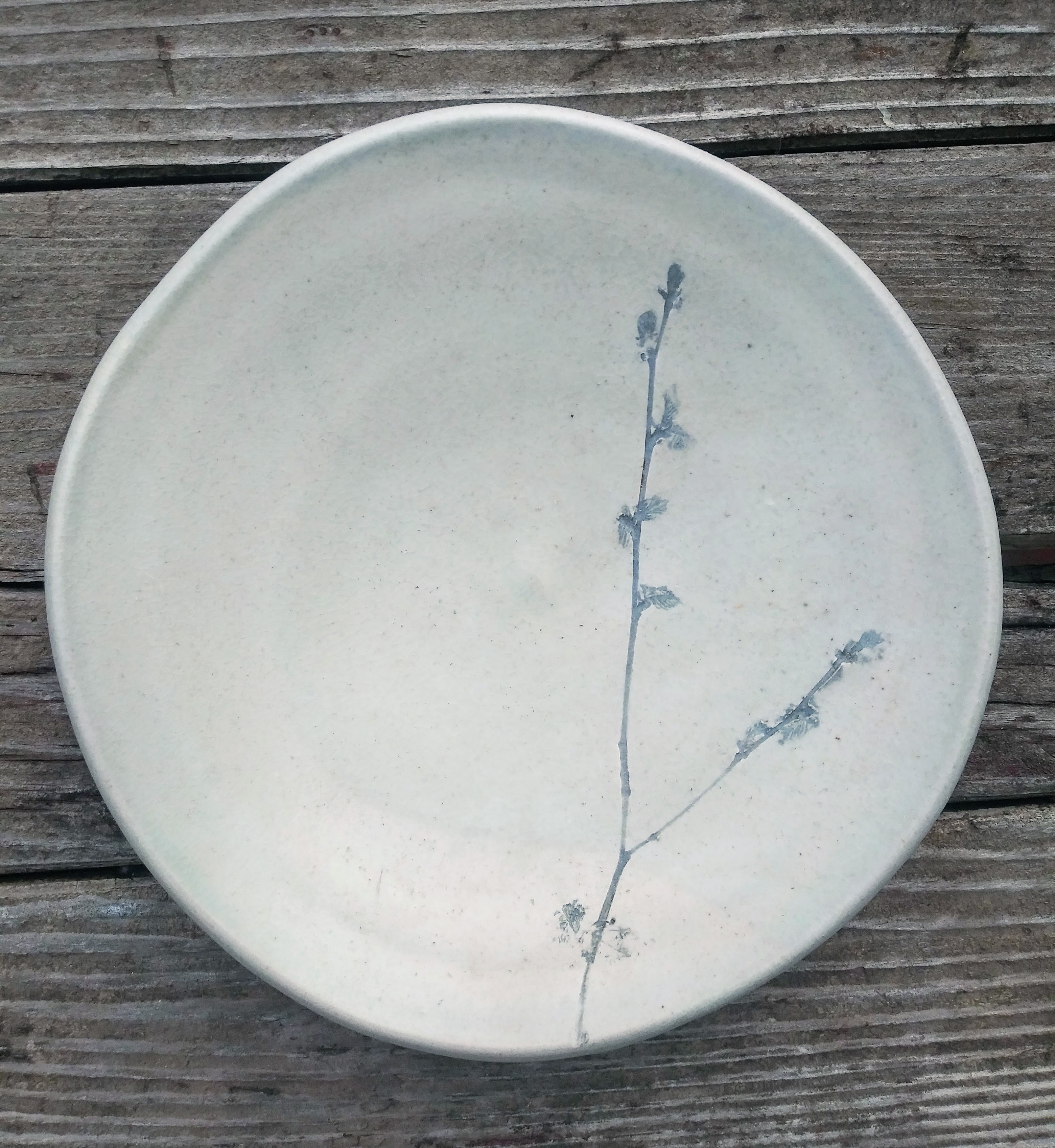 7.5″ wide, 1″ tall. White shino glaze with ash speckles, ghost of an real milkweed leaf under the glaze. Dark clay on underside of plate.