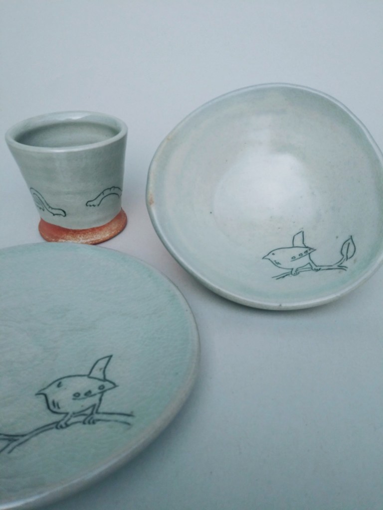 OK, Grandma, here’s your chance to win grandparenthood. A delightful set just the right size for a child, sturdily made to withstand all but the worst assaults as you teach your little protege the value of life with handmade goods. Safe, easy to clean celadon glaze with bird and inchworm drawings. Cup: 3″ tall. Bowl: 6″ wide. Plate: 6.5″ wide.