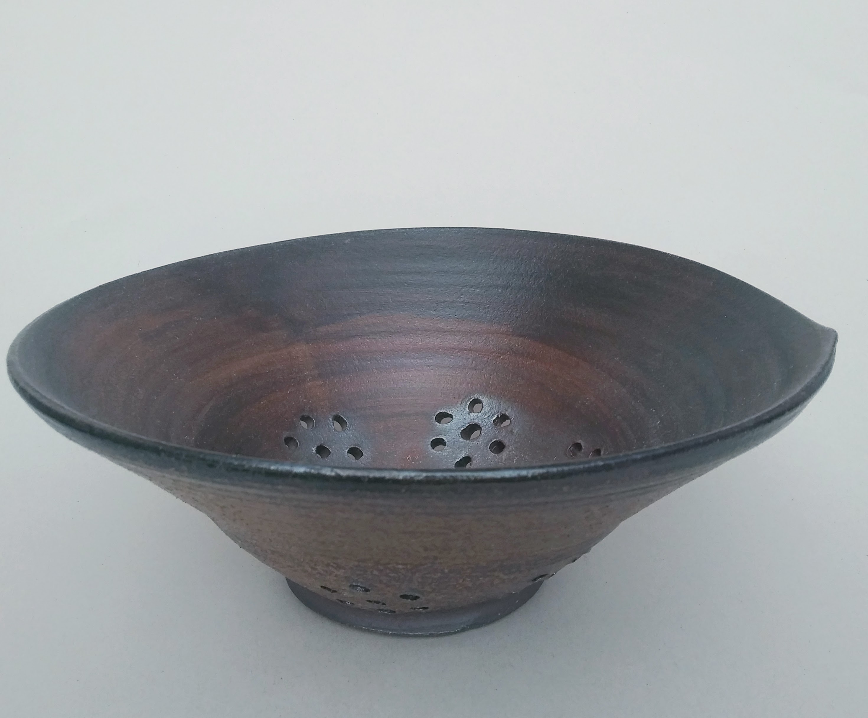 Naturally ash glazed dark clay make an earthy beauty with which to celebrate washing your greens. Or show off your strawberries beautifully by using it as a berry bowl. Intentionally off round. 9.5″tall, 4″high.