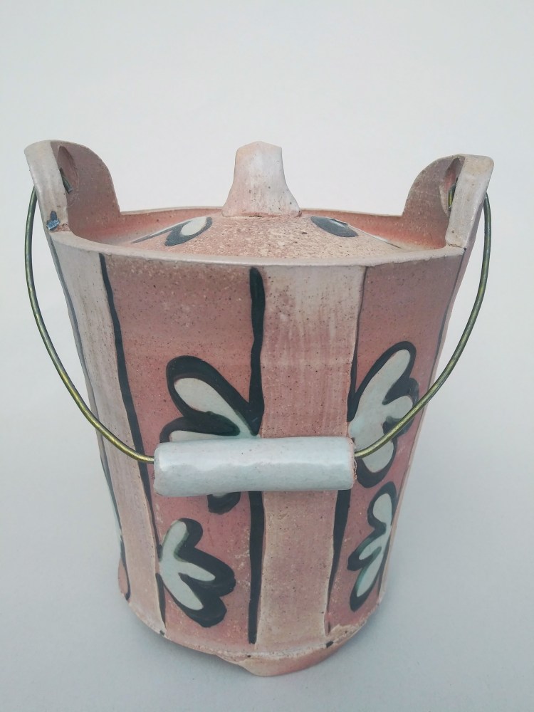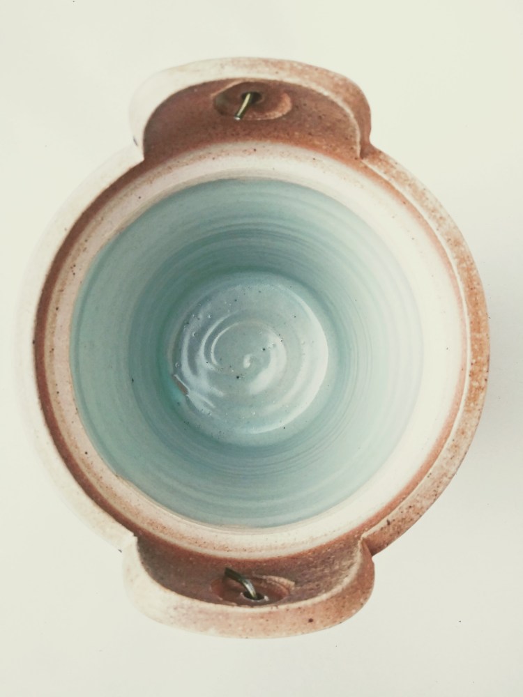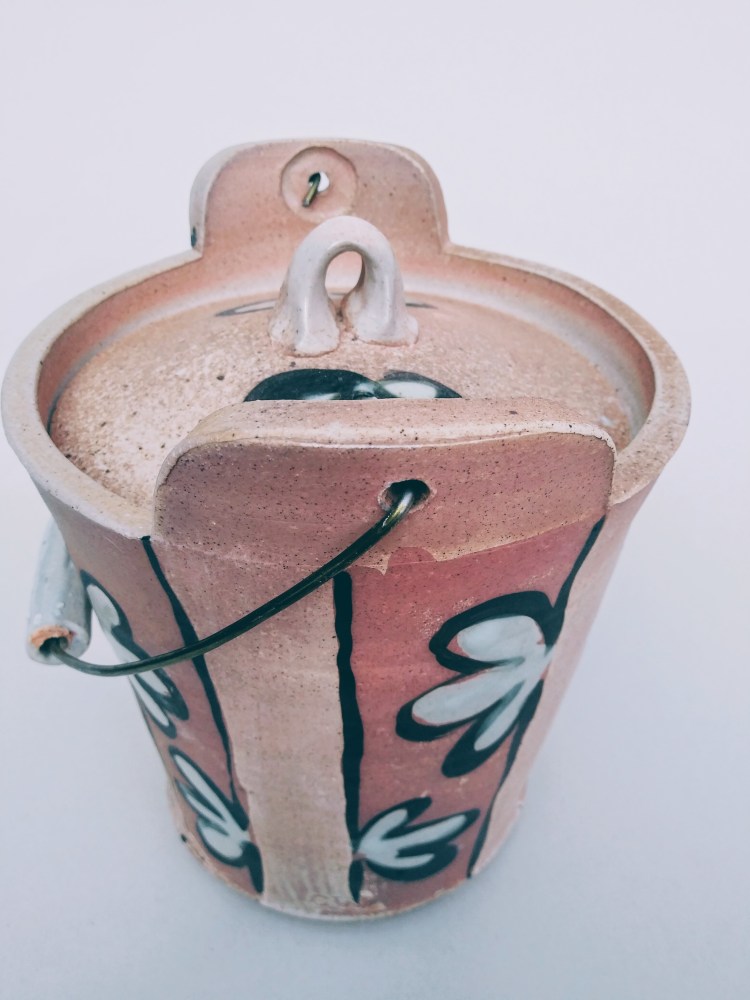 Admit it: do you or someone you love keep the compost in an ice cream bucket on the kitchen counter? Time to bring some elegance to your life. A naturally ash glazed bucket with slip decoration and pale blue celadon details, complete with wire handle. Hole in lid for ventilation. Small size for minimum odor. 7.5″ tall, 6″ wide.