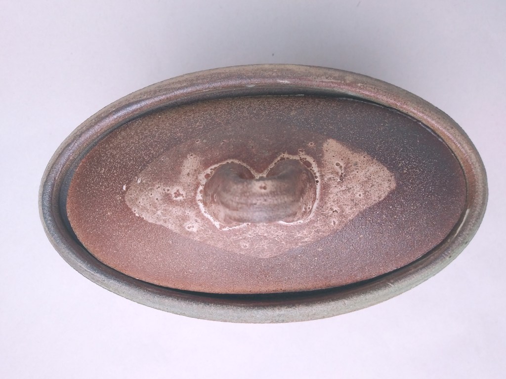 Thrown and hand-built stoneware vessel for baking or storage. Glossy shino interior glaze for easy cleaning; naturally ash-glazed matte exterior with slip decoration. 10″ wide, 6″ deep, 8″ tall with lid.