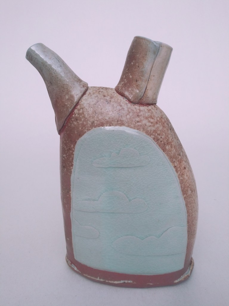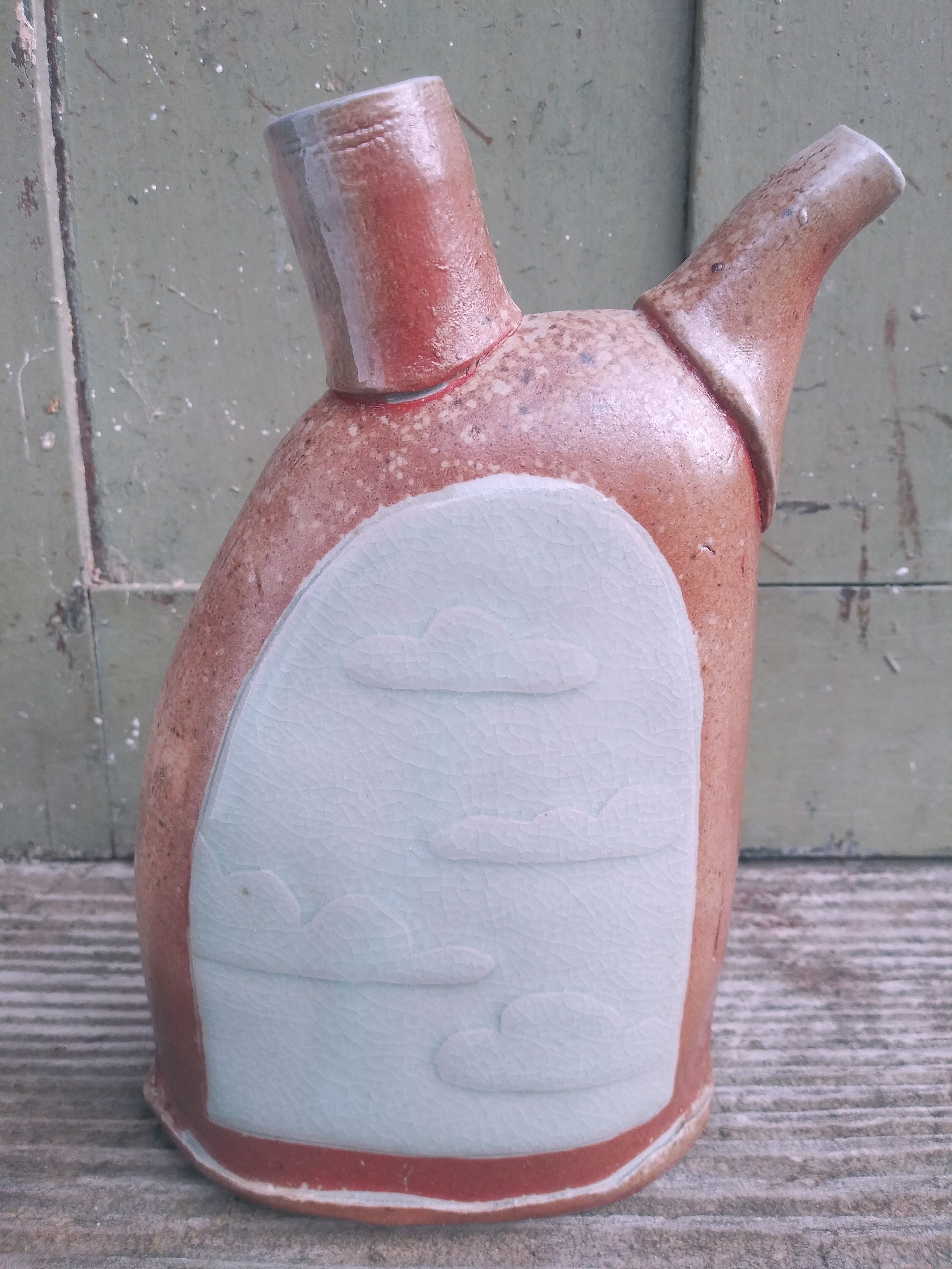 Slab-built, wood-fired bottle with a teeny tiny spout. What deliciousness could you pour out of there? In a pinch, it also makes a great vase for a flower or two. White clay with celadon glaze over the sweet impressions of little clouds. 7″high, 4.5″wide, 2″deep.