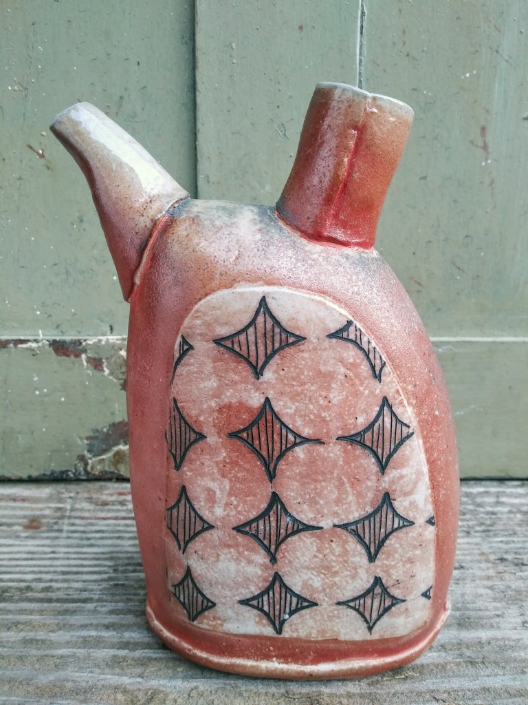 Slab-built, wood-fired bottle with a teeny tiny spout. What deliciousness could you pour out of there? In a pinch, it also makes a great vase for a flower or two. White clay with incised black lines. 7″high, 4.5″wide, 2″deep.